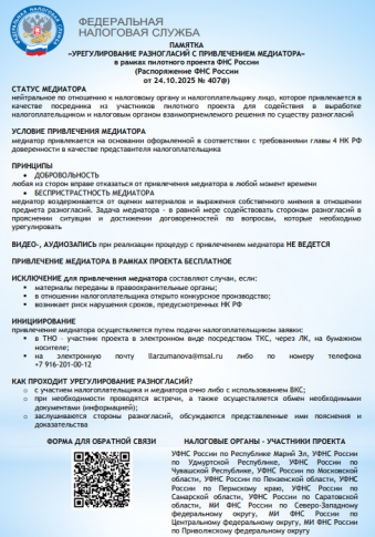 ПАМЯТКА «УРЕГУЛИРОВАНИЕ РАЗНОГЛАСИЙ С ПРИВЛЕЧЕНИЕМ МЕДИАТОРА» в рамках пилотного проекта ФНС России