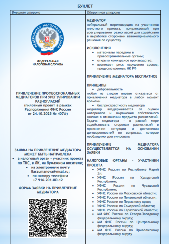 ПАМЯТКА «УРЕГУЛИРОВАНИЕ РАЗНОГЛАСИЙ С ПРИВЛЕЧЕНИЕМ МЕДИАТОРА» в рамках пилотного проекта ФНС России